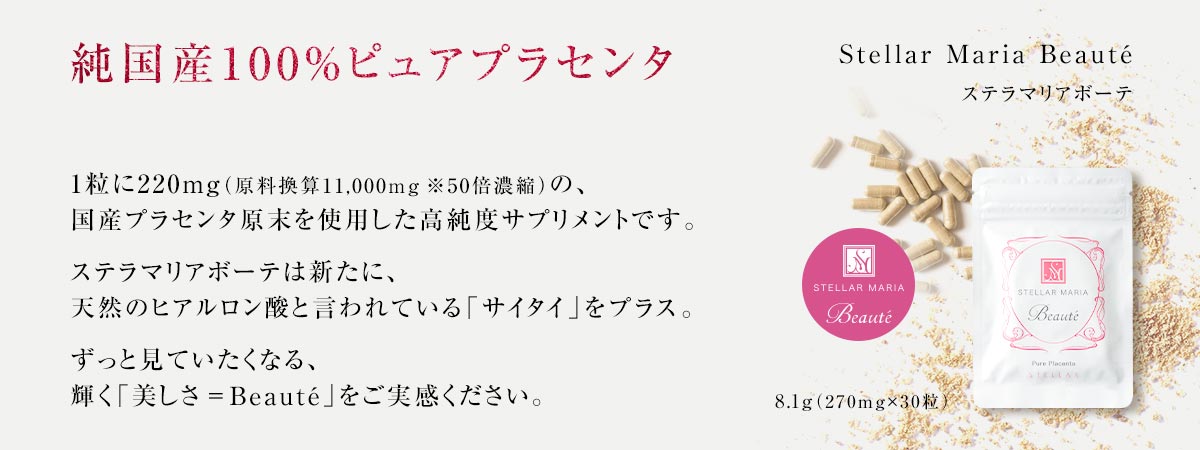 ステラマリア ボーテは国内産の豚プラセンタだけをカプセルに詰め込んだプラセンタ100%のサプリメントです。
